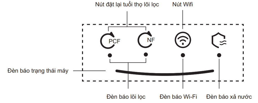 (5). Sau khi cắm điện và bật máy, hãy nhấn và giữ nút cảm ứng tương ứng với lõi lọc trên màn hình Led trong 3 giây. Một tiếng chuông báo sẽ vang lên và đèn hiển thị sẽ chuyển từ tắt sang sáng liên tục, cho biết quá trình đặt lại lõi lọc đã hoàn tất.