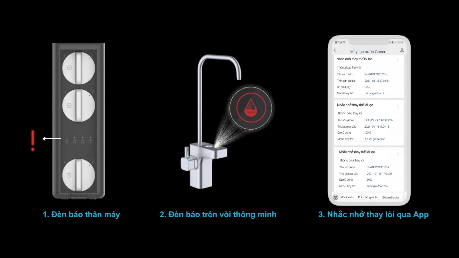 - Không lo vấn đề sử dụng lõi lọc quá hạn: Nhờ tích hợp chức năng nhắc nhở thay lõi qua hệ thống đèn báo trên vòi; Đèn báo thay lõi trên thân máy và nhắc nhở thay lõi qua App thông minh G+ Life.