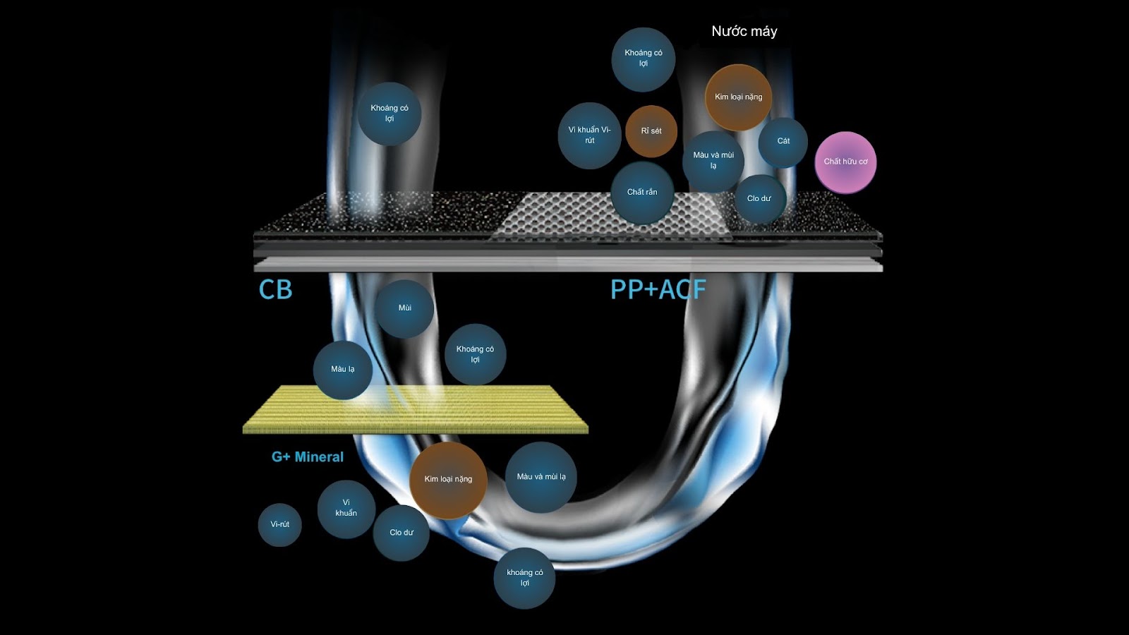 - Lõi lọc thế hệ mới, tích hợp 2 cấp độ lọc trong một lõi lọc, giúp người dùng không phải dùng/thay nhiều lõi mà vẫn đảm bảo hiệu quả lọc tối ưu.