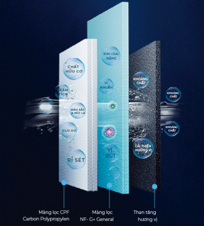- Lõi lọc thế hệ mới, tích hợp 2 cấp độ lọc trong một lõi lọc, giúp người dùng không phải dùng/thay nhiều lõi mà vẫn đảm bảo hiệu quả lọc tối ưu.