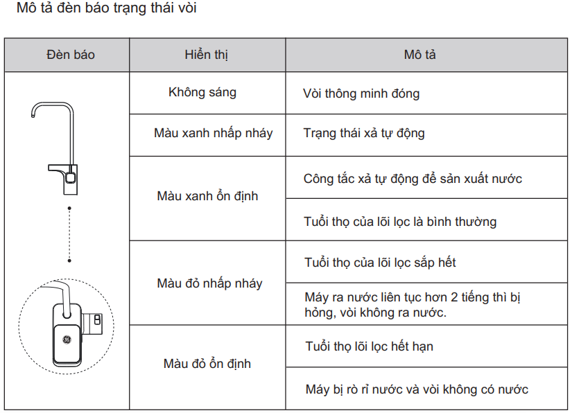Màu đỏ nhấp nháy: Tuổi thọ lõi lọc sắp hết, vui lòng chuẩn bị thay lõi lọc nước
