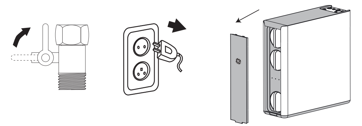 (1). Đóng van cấp nước, rút nguồn điện và mở nắp che