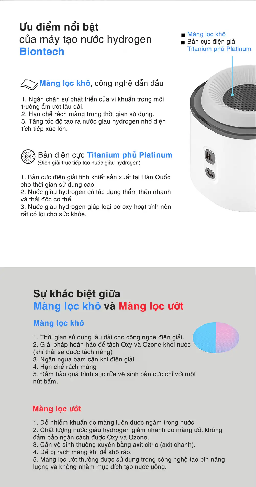 Vật liệu: Bản cực điện giải titanium phủ platium tinh khiết, hiệu suất điện giải cao và an toàn. Màng lọc khô tuổi thọ cao, chống khuẩn, hiệu quả tách Ozone khi điện giải.